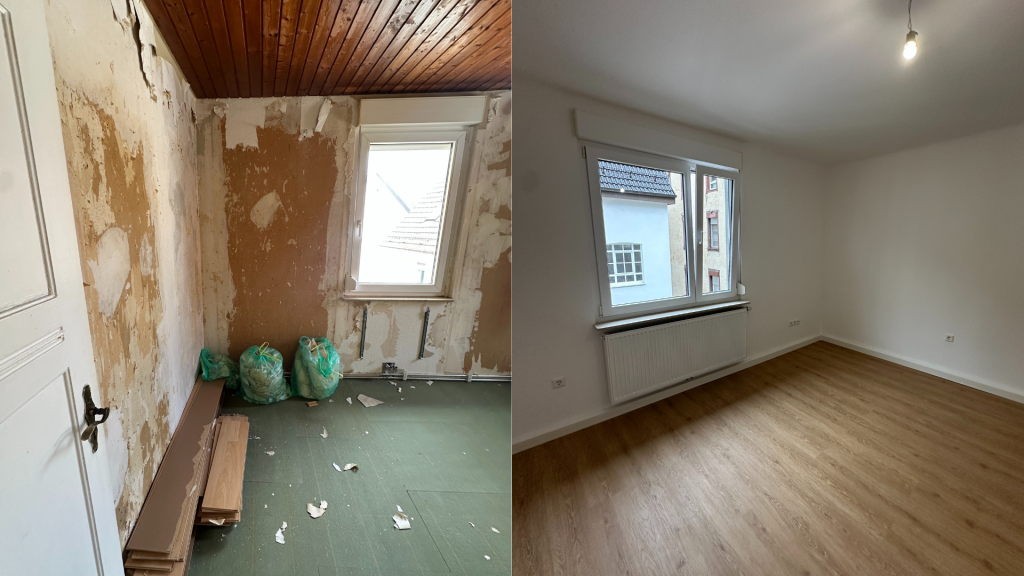 In der Eybacher Straße wurde eine stark sanierungsbedürftige Wohnung mit drei Zimmern und Flur vollständig modernisiert. Besonderes Augenmerk lag neben der optischen Aufwertung auch auf der Entfernung von hartnäckigem Rauchgeruch sowie der Anpassung der Elektroinstallation.